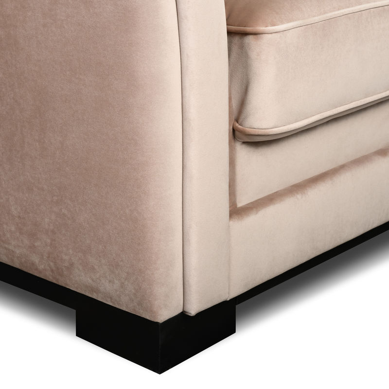 Обивка - ткань из ассортимента фабрики в бежевых тонах. Ножки из массива дерева, окрашены в черный цвет.