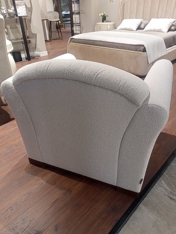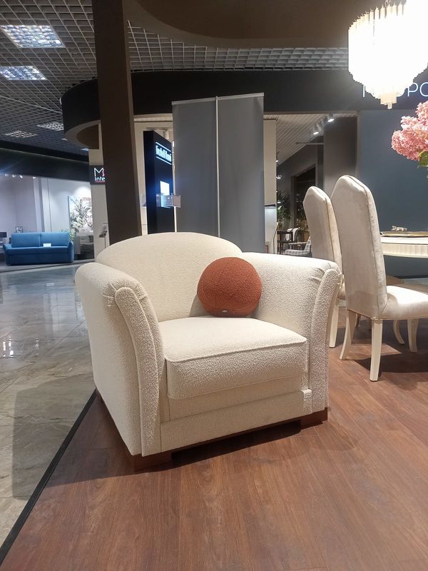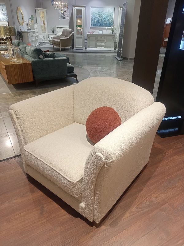Обивка - ткань букле в светло-бежевом, почти белом тоне. Ножки из массива дерева, тонированы под орех.