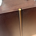 Буфет выполнен из высококачественного МДФ высокой плотности. Корпус выполнен в отделке из шпона ореха, декоративные детали и ножки из нержавеющей стали в цвете бронза. На ножках декоративные черные матовые колпачки, что придает буфету нотку строгости.