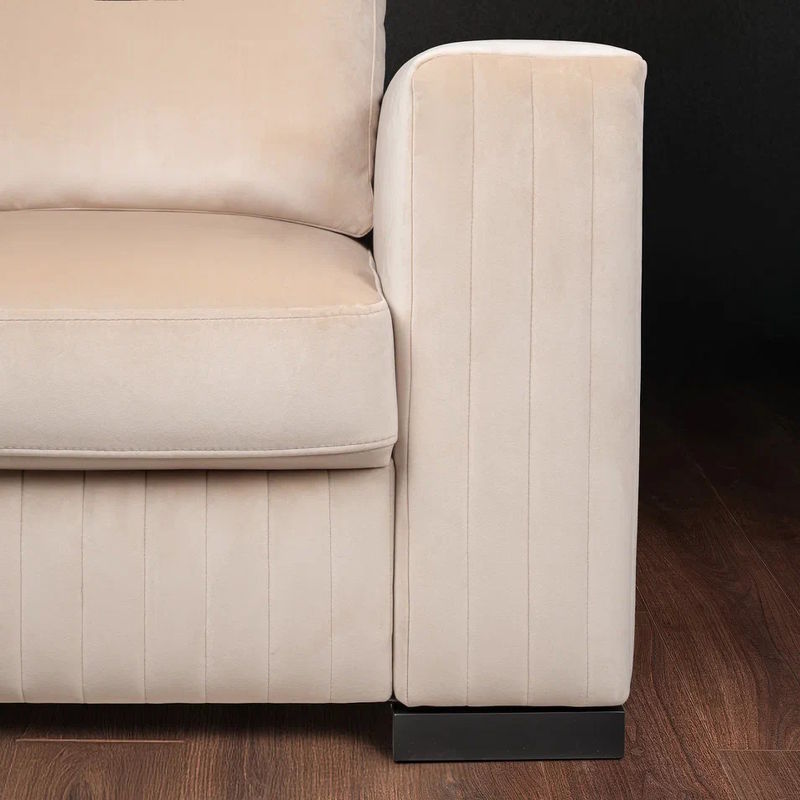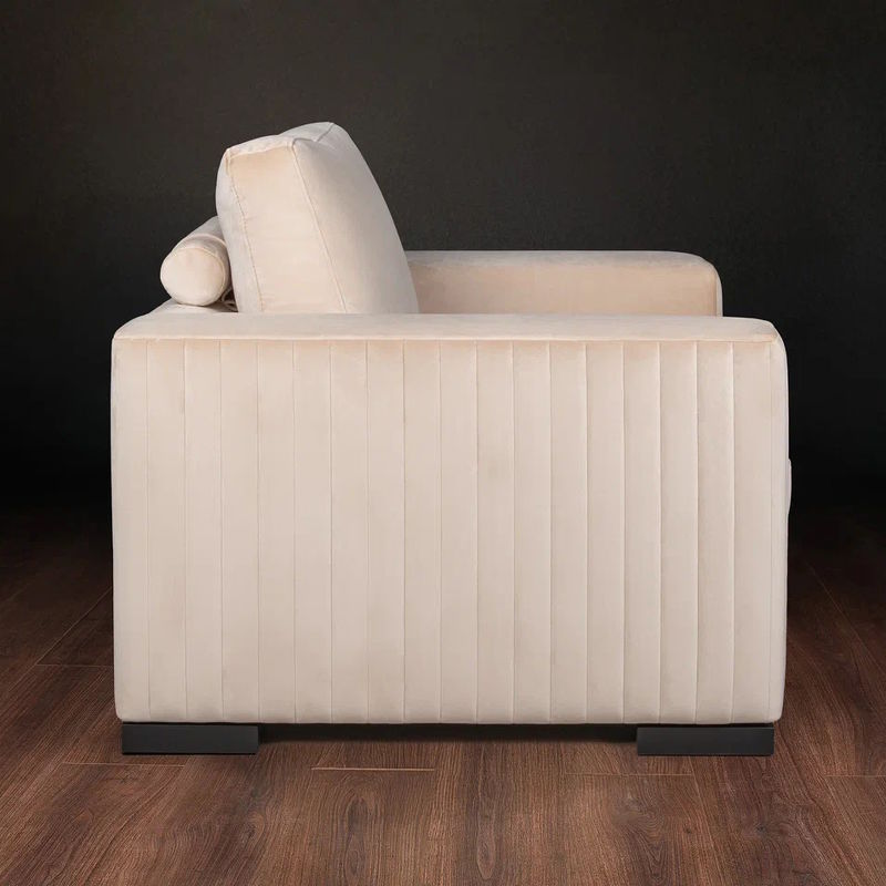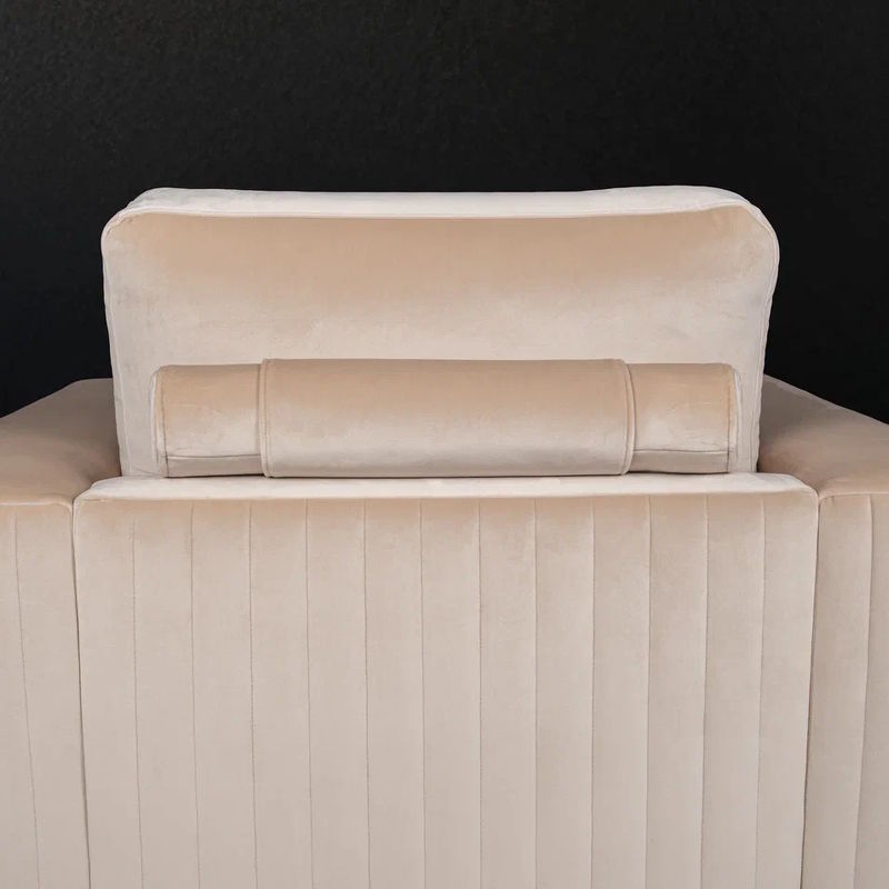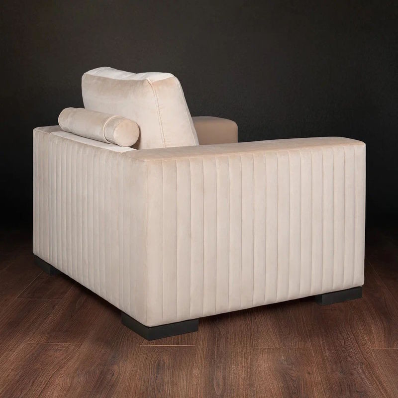 Кресло в обивке тканью бежевых тонов. Коллекция ткани Paddington состоит из модифицированного полиэстера, что позволяет волокнам пропускать свет и создавать перламутровый эффект, напоминающий натуральный жемчуг.
