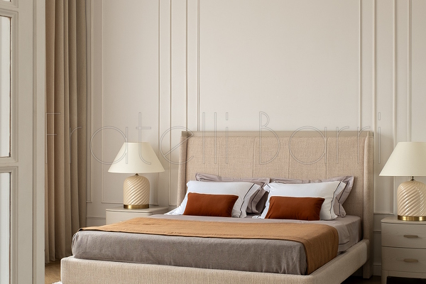 Изголовье декорировано несколькими вертикальными строчками, что придает кровати дополнительную декоративность.