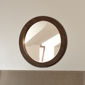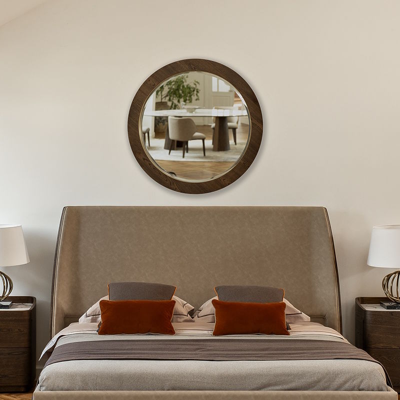 Рама зеркала выполнена из высококачественного МДФ, отделка - натуральный шпон высокосортного кронированного вяза, тонированного в теплый коричневый цвет. По внутреннему периметру рама дополнена кромкой в матовой нержавеющей стали в цвете латунь.