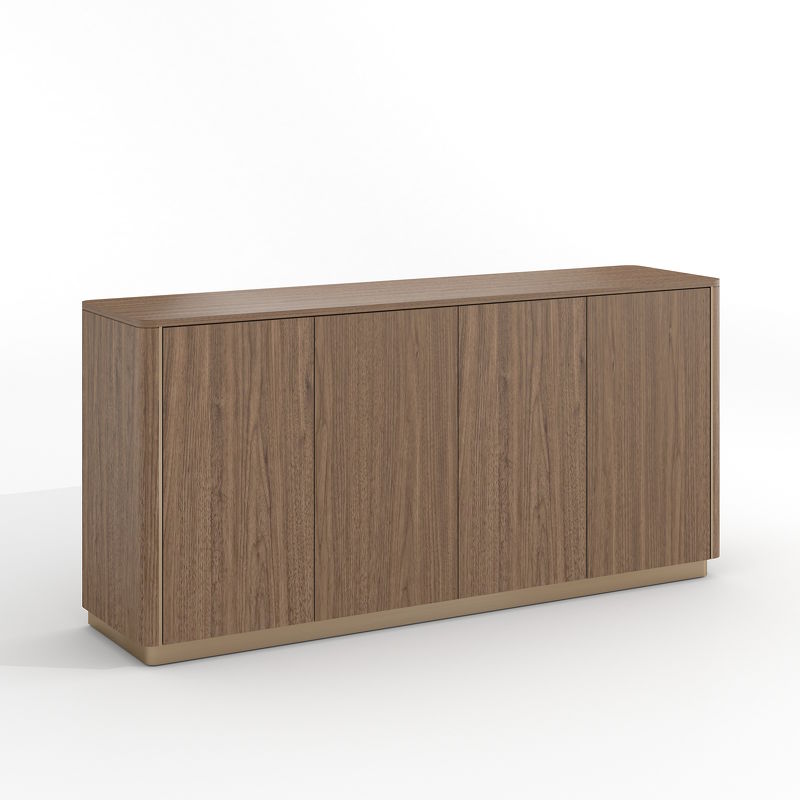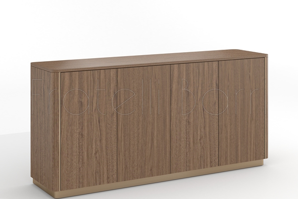 Буфет оснащен четырьмя дверцами, для комфортного хранения. Выполнен в отделке шпоном американского ореха, цоколь и детали - нержавеющая сталь.