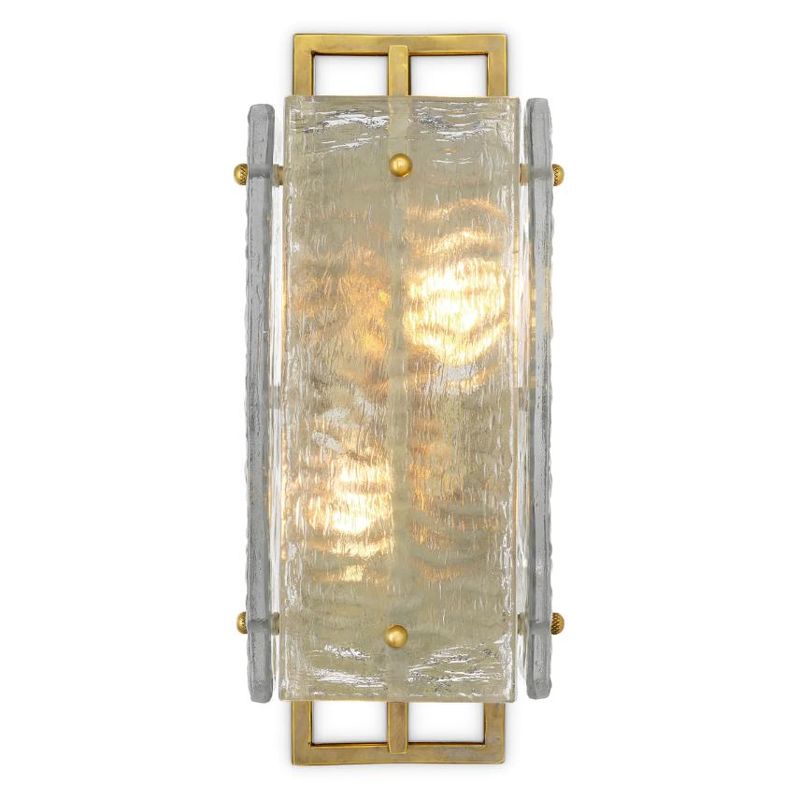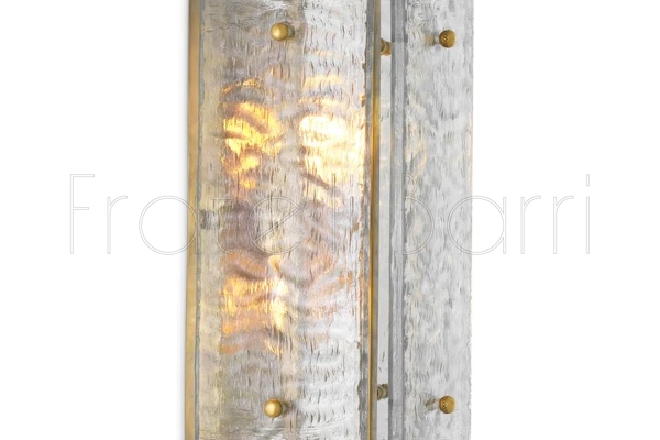 Этот великолепный настенный светильник имеет винтажную латунную раму, обрамленную прямоугольными панелями из выдувного стекла ручной работы, что придает ему элегантный и современный вид.