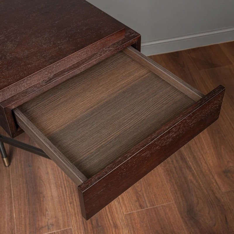 Столешница и фасад ящика выполнены из высококачественного МДФ. Отделка - натуральный шпон ореха тонированный в цвет горького шоколада. Ножки - металл в лаке черного цвета с легким глянцем. Рама зеркала, декоративные элементы на столешнице и колпачки на ножках - нержавеющая сталь в цвете латунь.