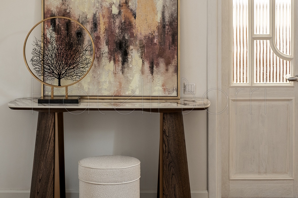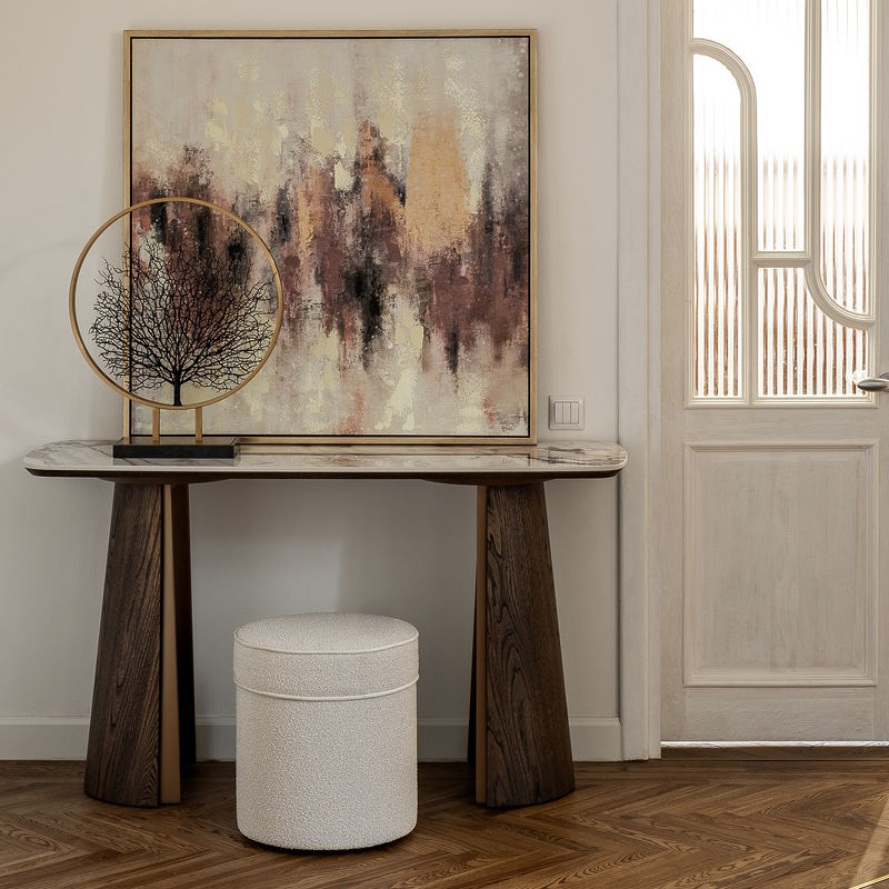 Элемент гостиной от Fratelli Barri: консоль коллекции Belmonte - плавная и лаконичная, выполнена в отделке натуральным шпоном высокосортного кронированного вяза, тонированного в теплый коричневый цвет. И пуфик Tresorino piccolo - нежный, компактный и уютный.
