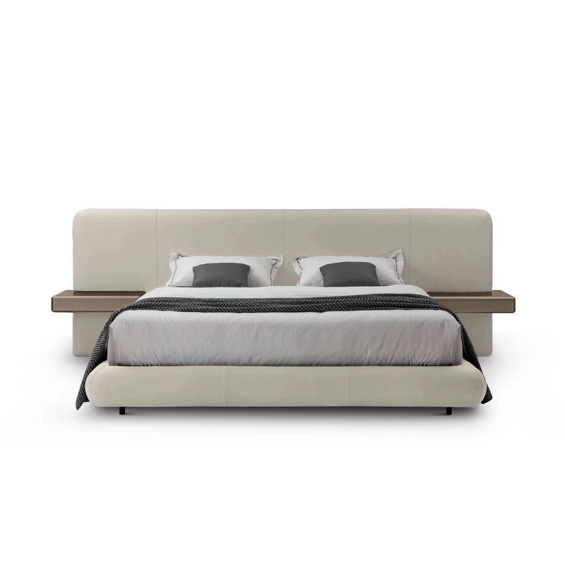 Двуспальная кровать с большим мягким изголовьем, оснащенным двумя выдвижными ящиками с каждой стороны, которые играют роль прикроватной тумбы.