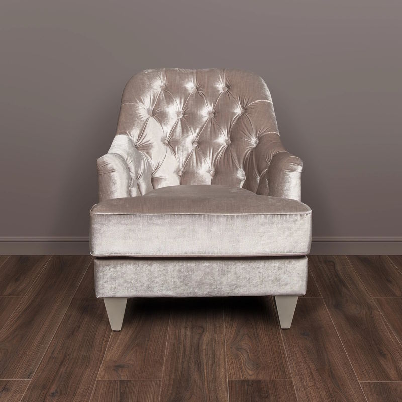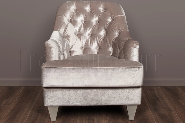 Каркас — натуральный массив дерева, отделка (ножки) — серебристое напыление, обивка — серо-серебристый велюр. Спинка и частично подлокотники декорированы стежкой капитоне.