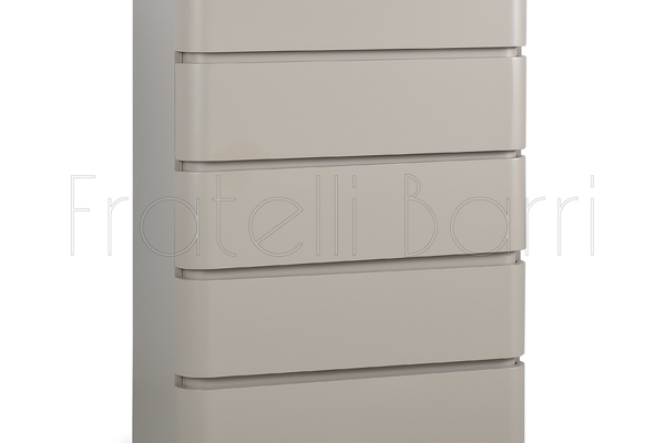 Высокий комод с ящиками от бренда Fratelli Barri, выполнен в стиле минимализм. Комод изготовлен из высококачественного МДФ в отделке - матовый серо-бежевый лак, декоративная вставка - брашированный никель.