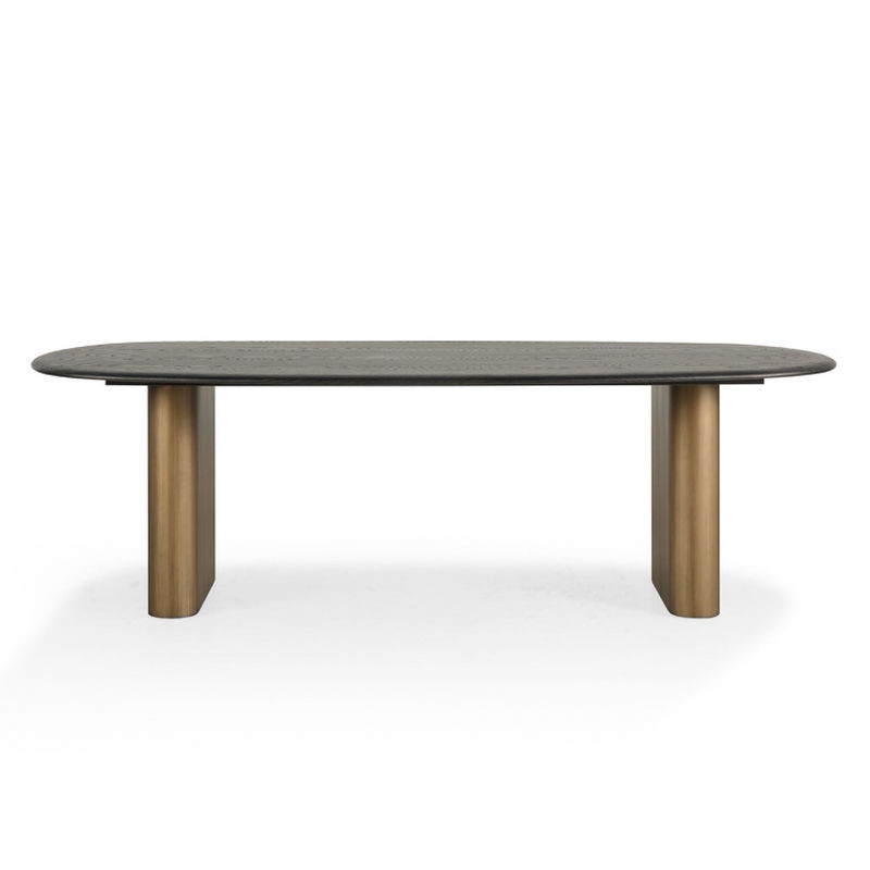 Благодаря внушительным размерам и благородному сочетанию тёплого шпона вяза с ножками в цвете латунь, стол задаёт тон всему интерьеру и становится его центром.