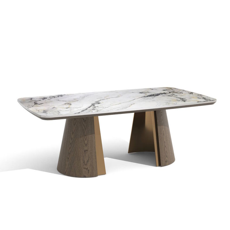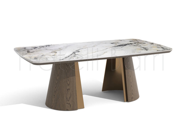 Столик с акцентной овальной керамической столешницей, дополнен примечательным основанием в отделке натуральным шпоном вяза, тонированным в теплый коричневый цвет.