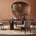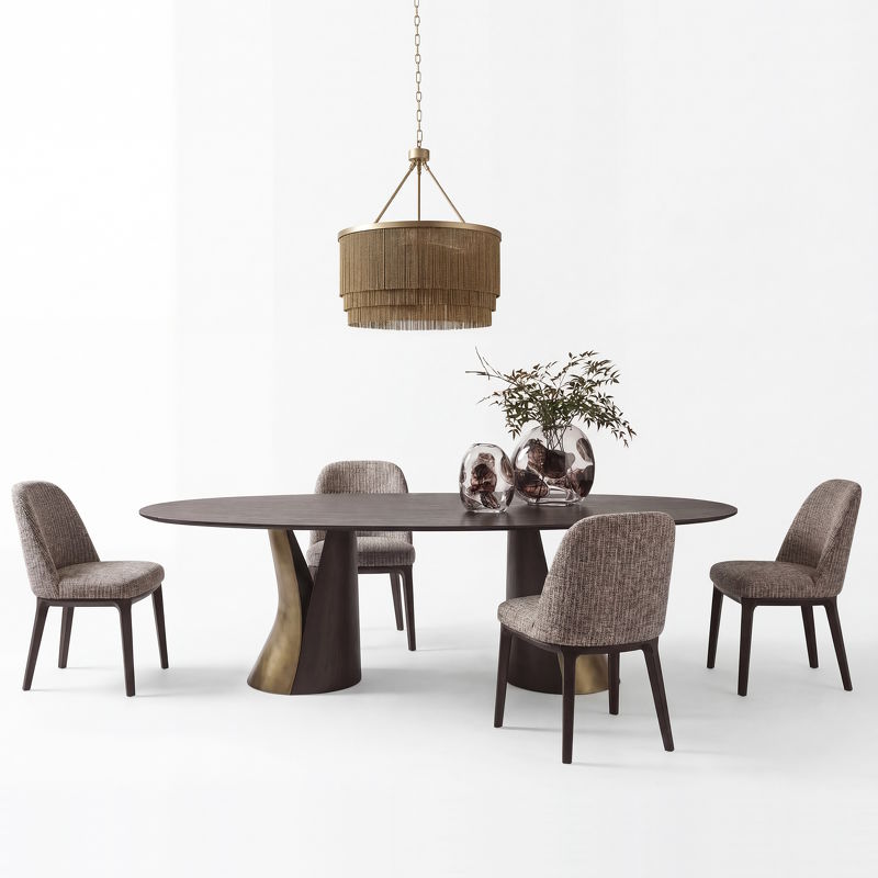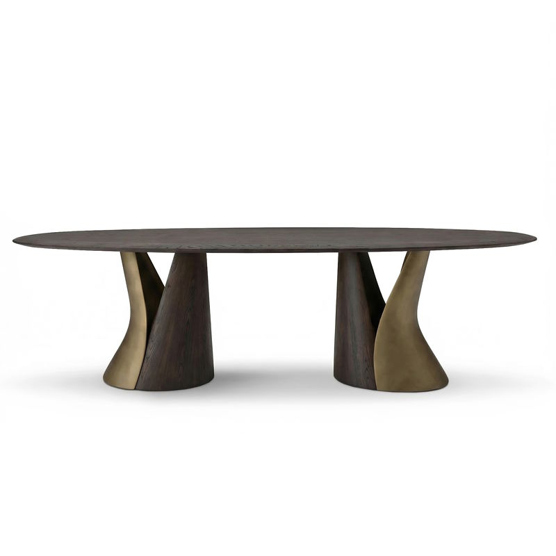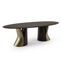 Овальная столешница выполнена в отделке матовым шпоном вяза, располагается на двойном основании: одна его часть продолжает отделку столешницы, вторая служит акцентной деталью - выполнена в отделке лаком цвета состаренная латунь, что придает столу особого шарма.