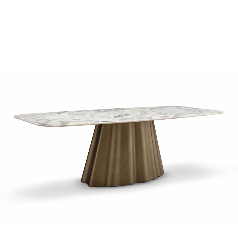 Столешница длинной 240 см выполнена из белого матового мрамора Dover, располагается на фигурном основании цвета латунь.