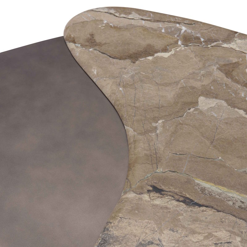 Основание стола металл в сером цвете, также и часть столешницы. Большая часть столешницы столика выполнена в мраморе, что придает столику эффектности и стиля.