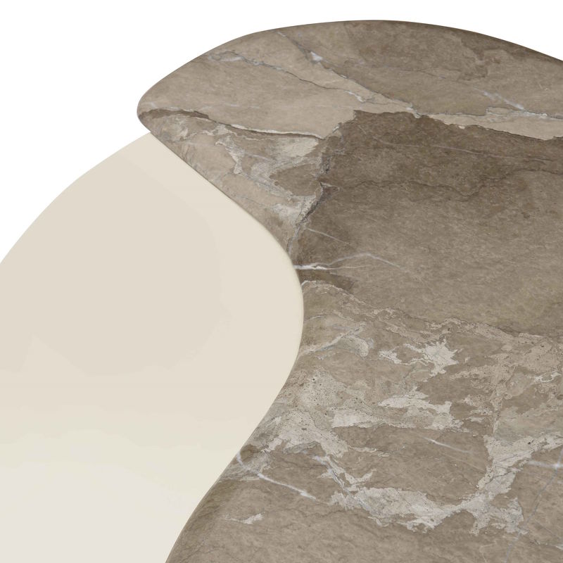 Основание стола металл в цвете хаки, также и часть столешницы. Большая часть столешницы столика выполнена из травертина - натурального камня.