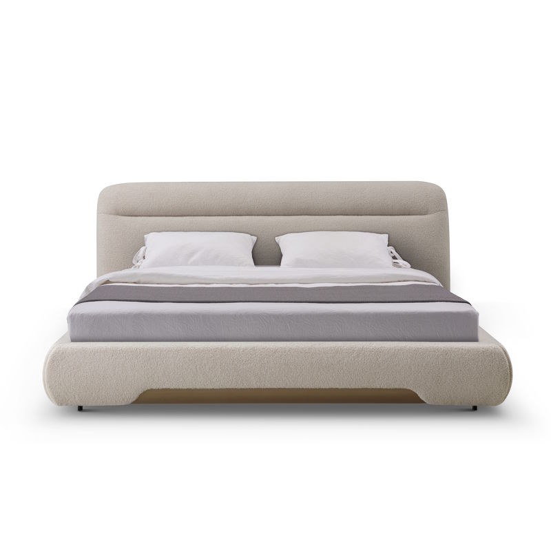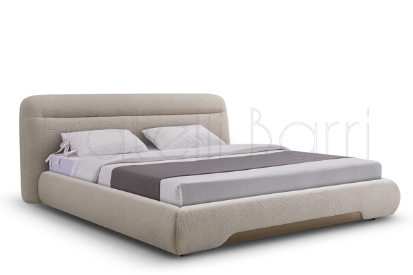 Кровать выполнена в отделке тканью, ножки металл в матовом лаке черного цвета, детали в цвете латунь.
