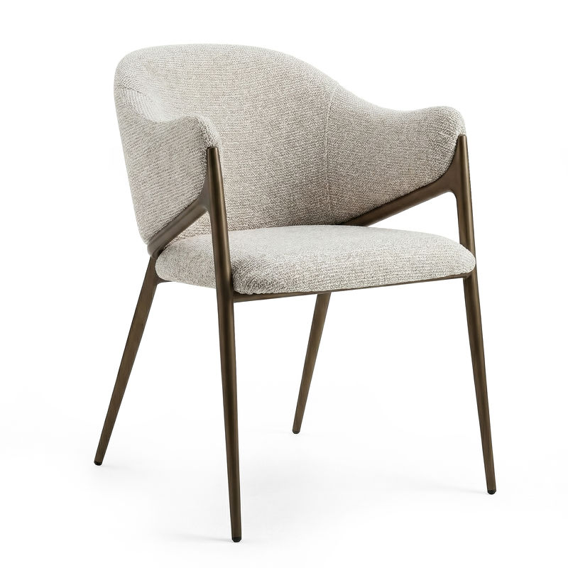 Надежная основа из металла обеспечивает безупречную устойчивость, а мягкая обивка из высококачественного текстиля дарит приятные тактильные ощущения. Спинка и подлокотники продуманы для максимального удобства, даря телу необходимое расслабление. Отделка ножек в оттенке матовой бронзы придает модели изысканную глубину и легко вписывается в актуальные интерьерные тренды.