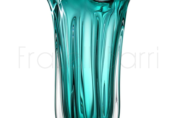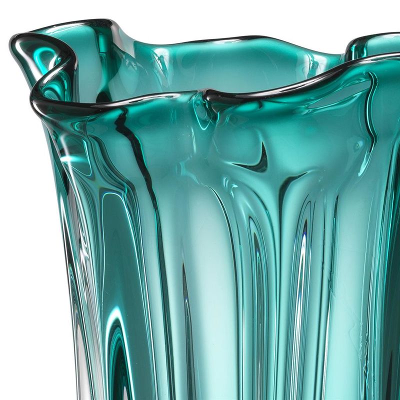 Вытянутая ваза с фигурным краем выполнена вручную из выдувного стекла.
