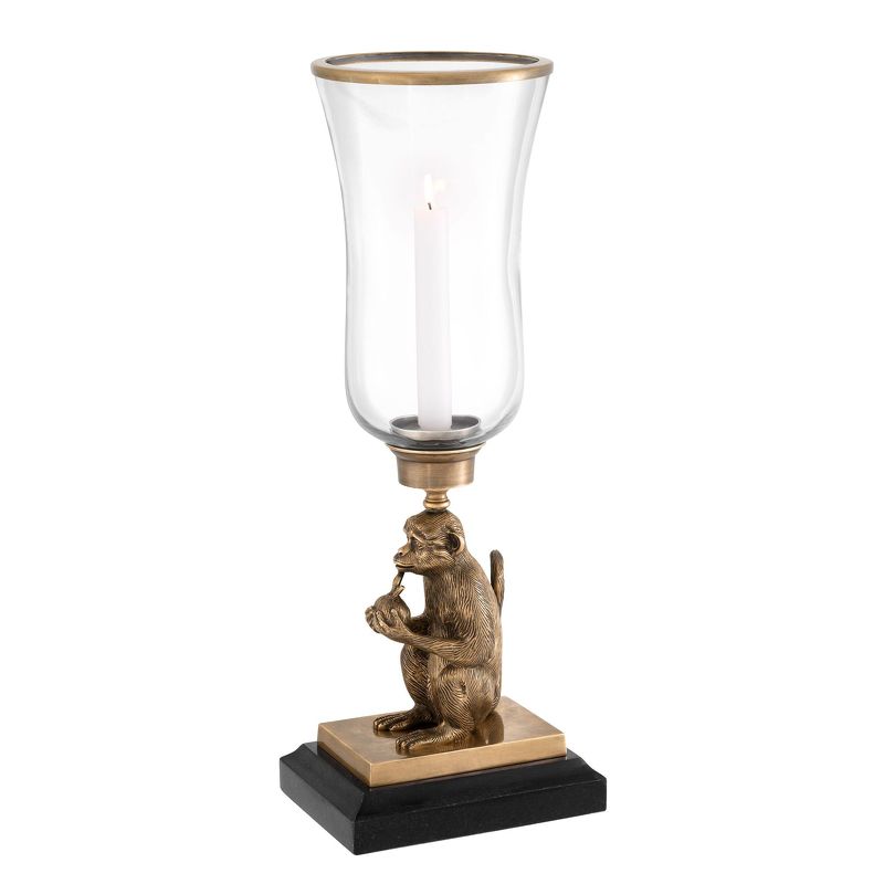 Фигурный подсвечник в виде обезьяны выполнен из латуни. Основание из гранита. Подсвечник дополнен высоким стеклянным плафоном, рассчитан на одну свечу.