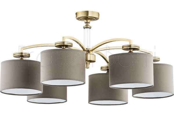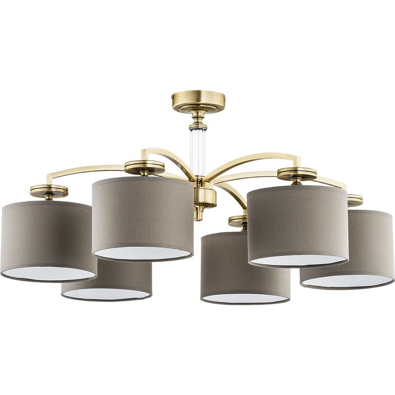 Элегантная люстра выполнена в классическом стиле из латуни, основание декорировано стеклянной вставкой. В комплекте конические тканевые абажуры. Функциональная и изящная модель станет достойным дополнением интерьера. Люстра рассчитана на шесть ламп.