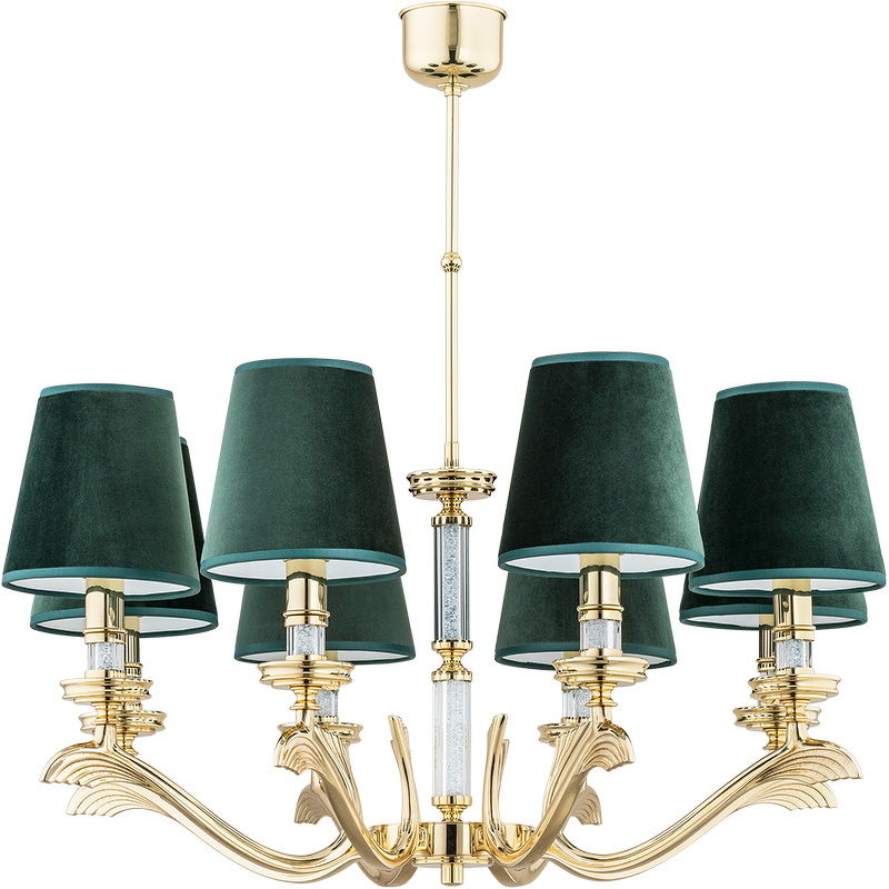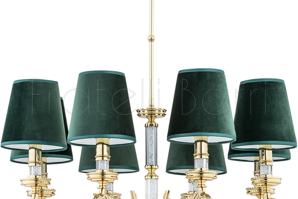 Люстра выполнена в классическом стиле. Латунное основание дополнено нежным абажуром и декорировано хрусталем и кристаллами Swarovski. Функциональная и изящная модель станет достойным дополнением интерьера. Рассчитано на восемь лампочек.