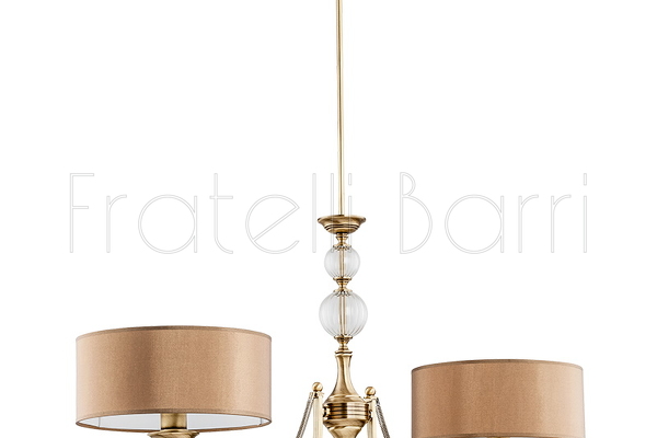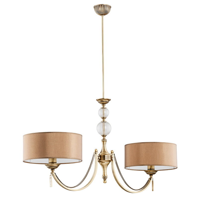 Люстра выполнена в стиле модерн. Латунное основание дополнено нежным абажуром. Функциональная и изящная модель станет достойным дополнением интерьера. Рассчитано на две лампы.