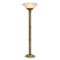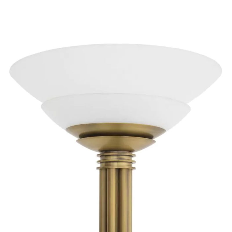 Элегантное основание и ножка, выполненные из античной латуни, красиво контрастируют с двумя абажурами в форме чаши из белого стекла, определяющей его утонченный и привлекательный вид.