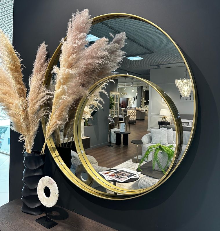 Зеркало выполнено в стиле Ар-деко. Круглая лакированная рама обрамляет двойное зеркало.
