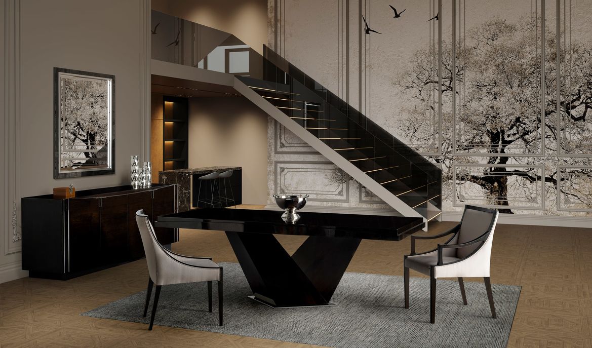 Обеденный стол Lloyd, отделка черный глянцевый ясень, цвет металла латунь